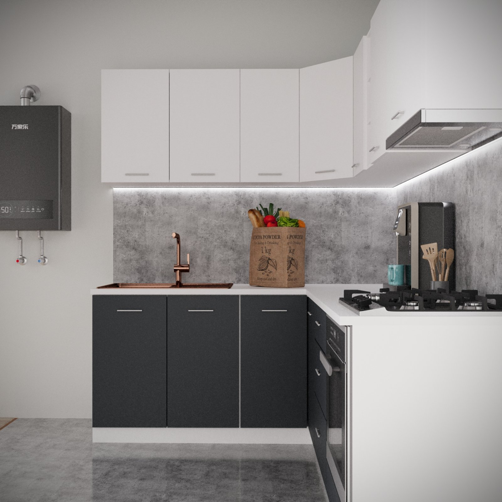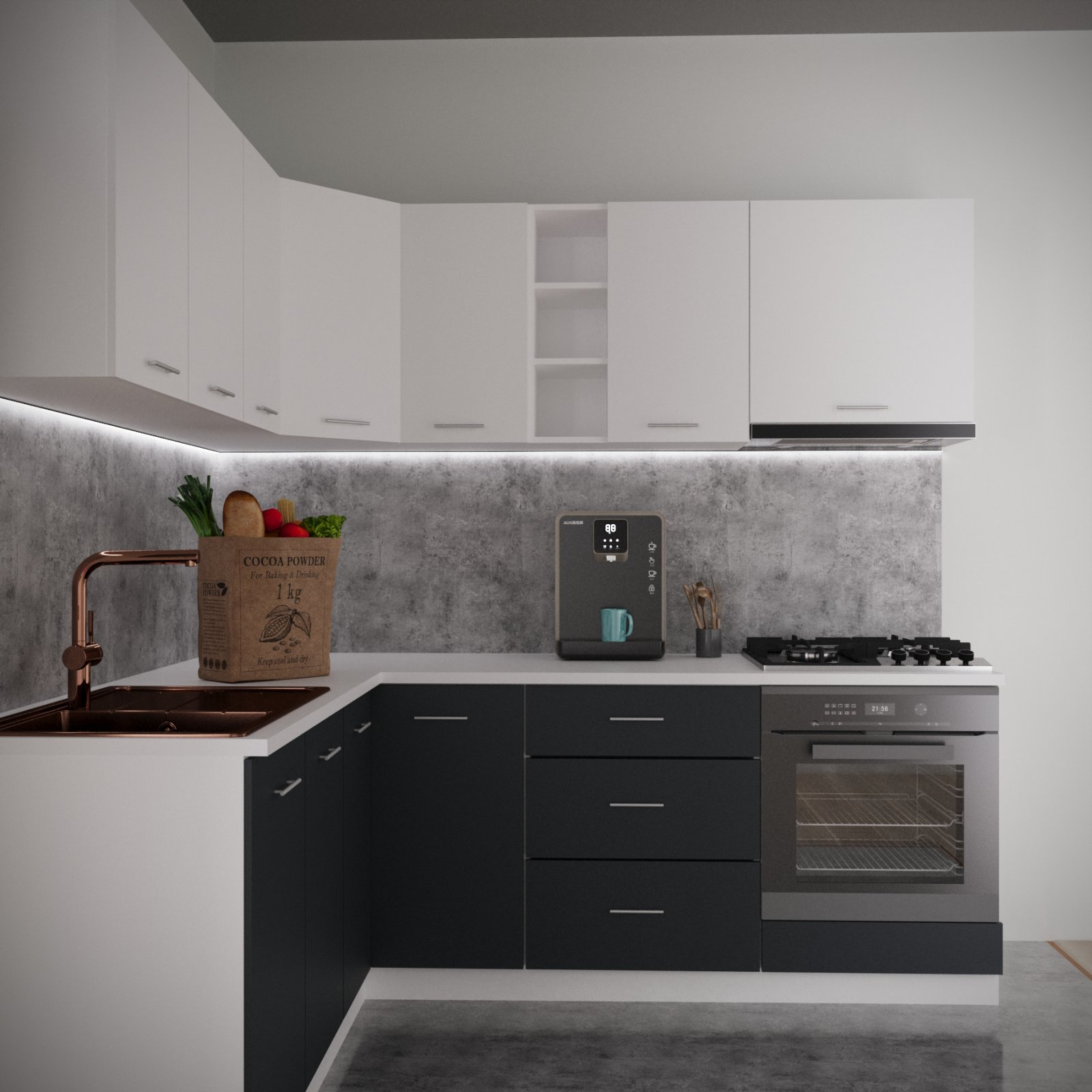 Daca spatiul tau se rezuma la 180 x 220 cm si esti un iubitor al culorii Alb&Antracit, noi iti recomandam mobila de bucatarie Sena Colt !