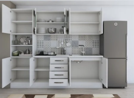 Daca spatiul tau se rezuma la 220cm si esti un iubitor al culorii Alb, noi iti recomandam mobila de bucatarie Karina!
