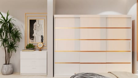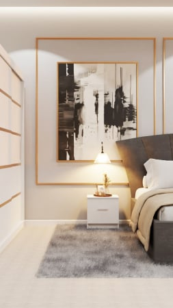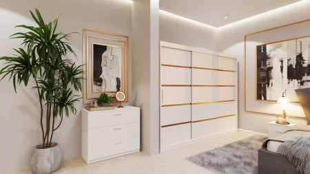 Dormitor Lucas Tapitat cu dulap 250*200 usi glisante Alb, noptiere si comoda
