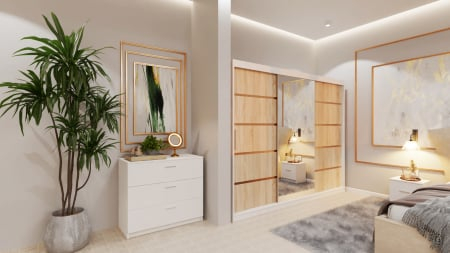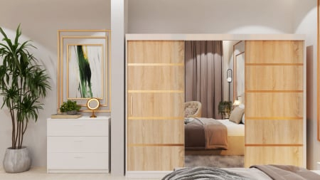 Dormitor Lucas Tapitat cu dulap 250*200 usi glisante Alb&Sonoma cu Oglinda, noptiere si comoda