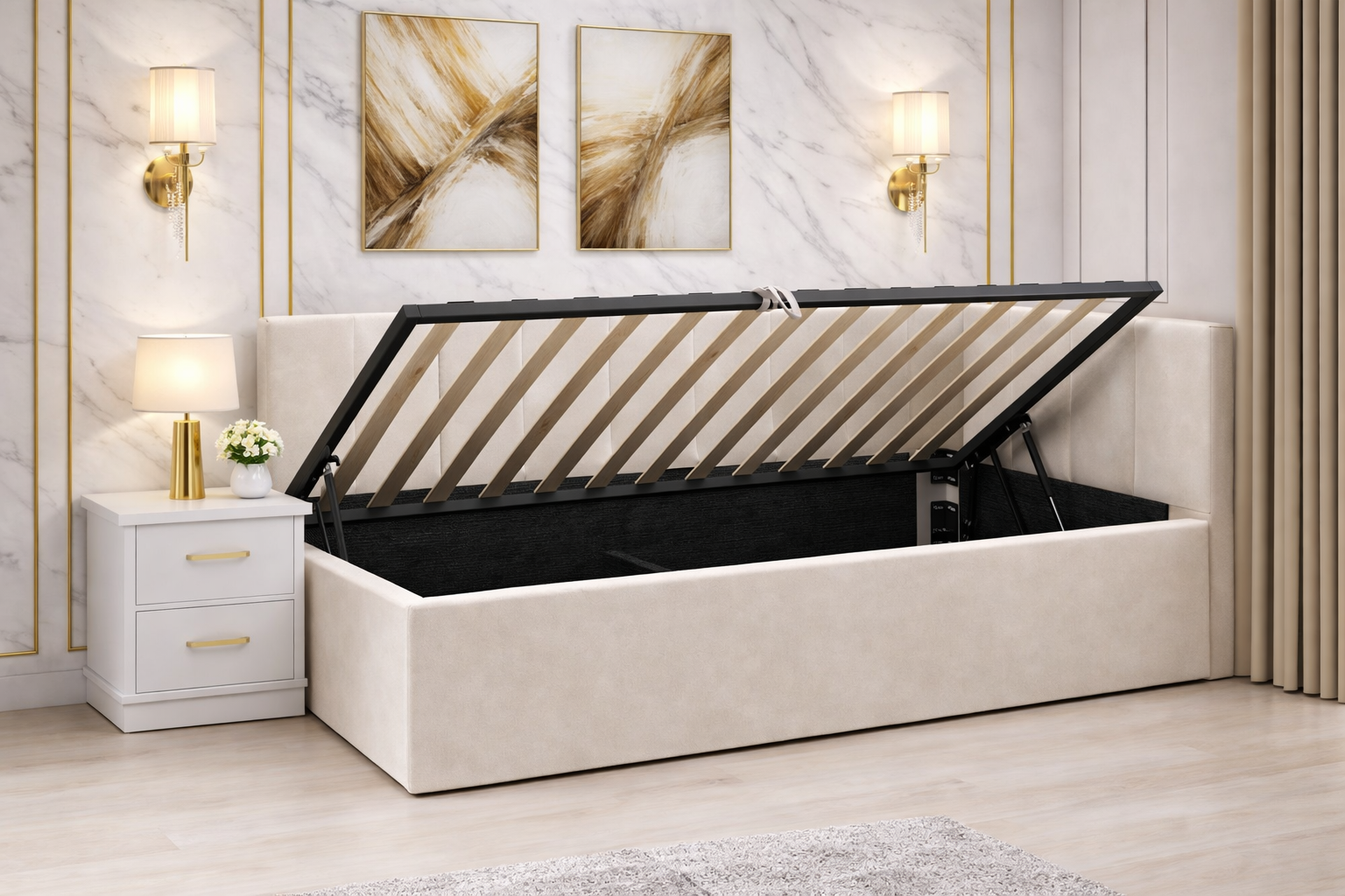 Pat Tapitat Bubu cu Somiera Rabatabila si Lada de depozitare